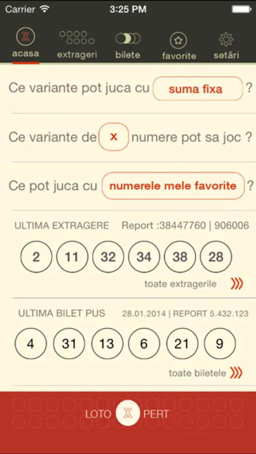 Aplicatia Loto Xpert 6/49 este asistentul tau virtual pentru jocul loto 6 din 49. Aplicatia te ajuta sa gasesti cele mai bune combinatii de numere in functie de numerele favorite, suma pe care vrei sa o joci sau cate numere ti-ar placea sa joci. Astfel alegerea unei scheme redusa sau a unei variante combinata compusa este extrem de simpla. Loto Xpert iti pastreaza toate biletele pe care le-ai jucat la indemana si te anunta daca ai castigat. Poti verifica si tu acest lucru accesand detaliile biletului salvat cu data extragerii.