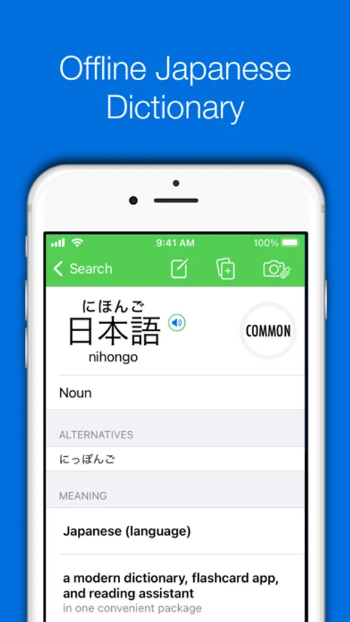 Nihongo is an offline Japanese dictionary, flashcard app, and reading assistant, designed to make the best use of the time you dedicate to studying Japanese.