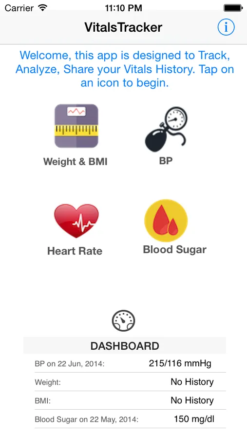 Keep a track of your Blood Pressure, Weight, BMI, Blood Sugar and Heart Rate. View history, Email history and Analyze monthly and yearly trends of your Vitals.