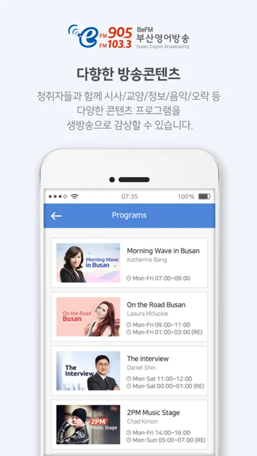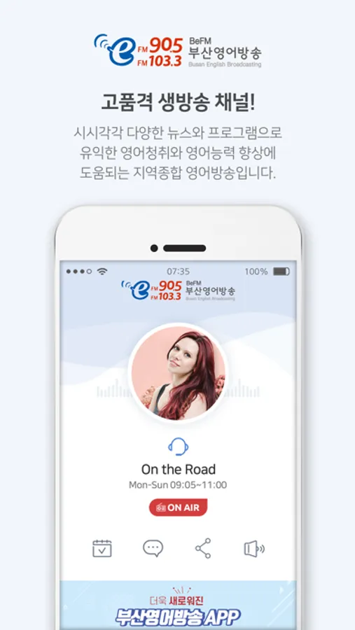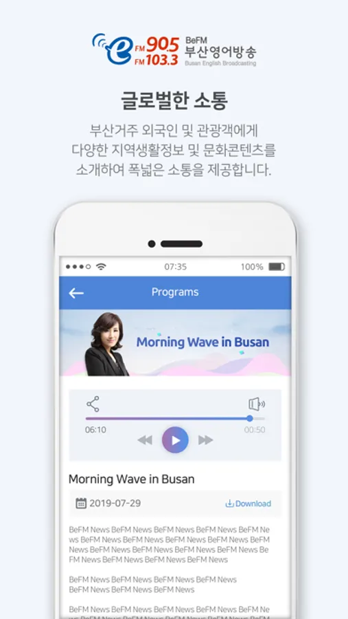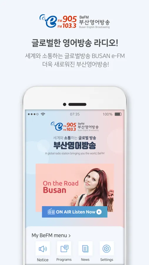 Busan e-FM's smartphone application will enable you to listen to live broadcasts in real time in the palm of your hand so that you can access a wide range of information including news, weather forecasts, and AODs.