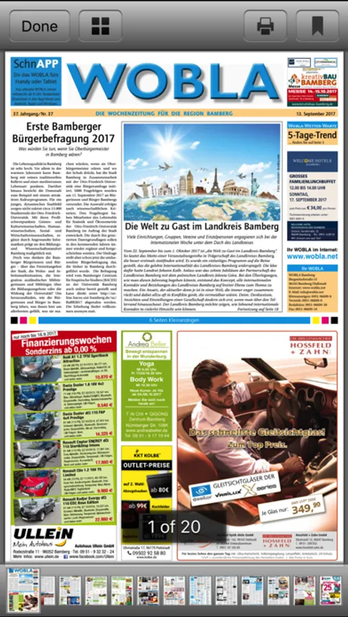 Seit vielen Jahren wird die Zukunft der Zeitung in Frage gestellt, das von stets geliebte und teils vergötterte Internet sei der Sargnagel des gedruckten Wortes. Wird behauptet. Immer wieder. Doch man kann es auch ganz anders sehen. Sicher hat das „world wide web“ viele interessante Facetten: Es ist schnell und überall auf dem Globus verfügbar. Diese WOBLA-App ist der beste Beweis dafür. Aber ein kompletter Ersatz für eine Zeitung, die noch dazu kostenlos ins Haus gebracht wird? Nein, das glauben wir nicht. Eine schöne Ergänzung. Ja! Aber mehr auch nicht. Sicher haben wir mit dieser App unser Portfolio um eine nette und sehr interessante Facette erweitert. Doch unser Kerngeschäft ist und bleibt unser gedrucktes WOBLA. Jeden Mittwoch. Frei Haus. Viel Spaß beim Lesen wünscht Ihnen das WOBLA-Team aus der Biegenhofstraße 15 im Gewerbegebiet Bamberg Hallstadt Hafen!