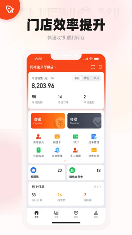 小程序微商城—— 门店内商品一键上架、自动同步;商品,储值,会员,订单,折扣线上线下同步互通,无需分开打理;支持限时限购、会员分销、店员分销、拼团拼单、视频直播、直播带货、积分兑换、积分专区;多种模板、零基础装修网店,提供早期上架开通代运营服务;资料齐全当日开通。