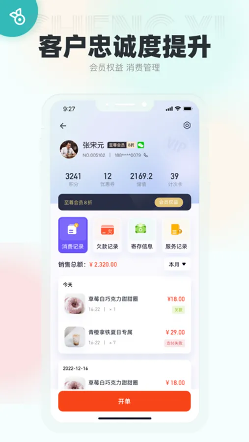 会员管理 ——多种标签、多级会员、消费趋势、人脸识别、计次卡管理、储值卡管理、会员积分、生日提醒、欠款提醒、预约提醒、寄存提醒、会员到店提醒、会员分析等;支持微信会员卡;