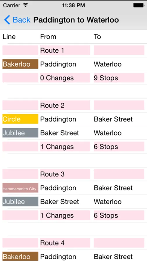 The search provides you with a list of alternative routes which can be used to travel from the source to destination station. It provides you with the number of line changes and station stops involved in each route.