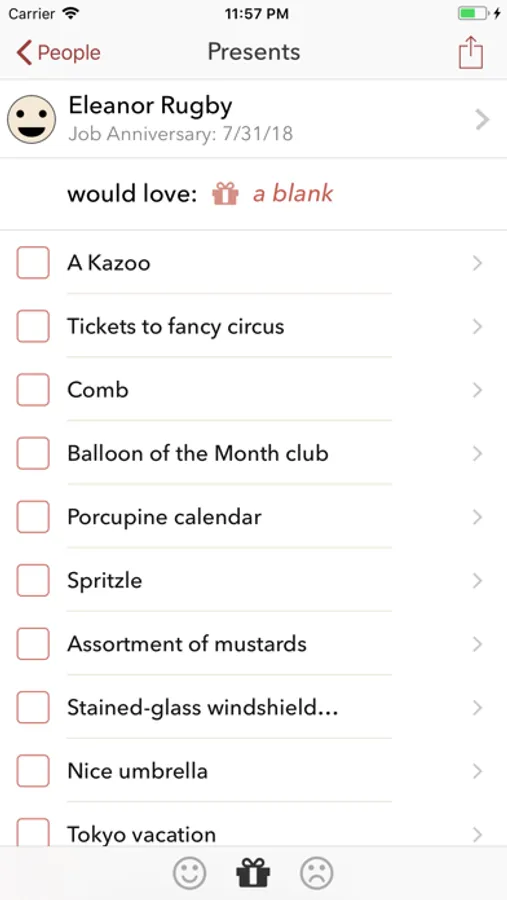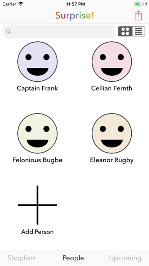 Surprise is a tool for remembering great gifts for the people in your life. Every time you think of a good present for someone, use Surprise to jot it down. The next time they have a birthday (or graduation, or anniversary), you'll find yourself with a ready-to-go list of fantastic gift ideas at your fingertips!