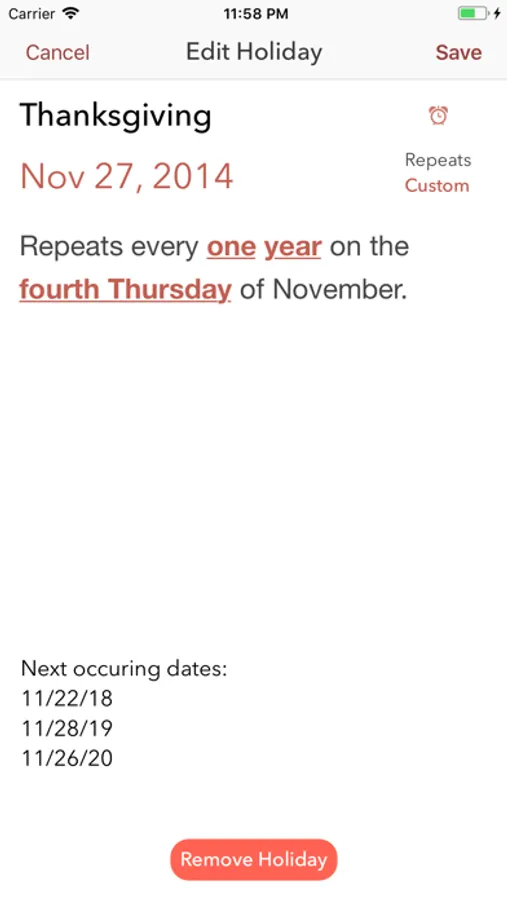 • An advanced custom event creator (for dates such as "The first Tuesday of every other month").