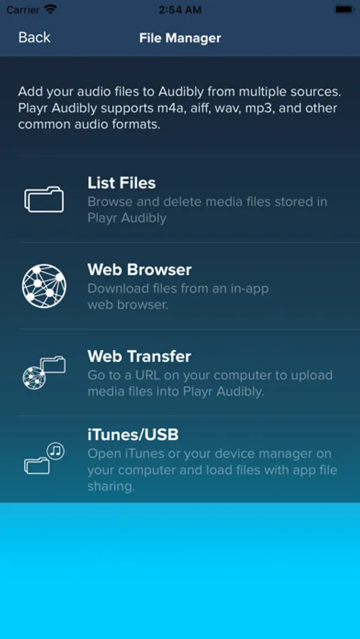 Audibly is an offline music player and wireless surround sound system for iOS devices. To add music, copy music files, like m4a, wav, and mp3, through the built-in file manager. Then Audibly will automatically sort through all the files and organize a new music library.