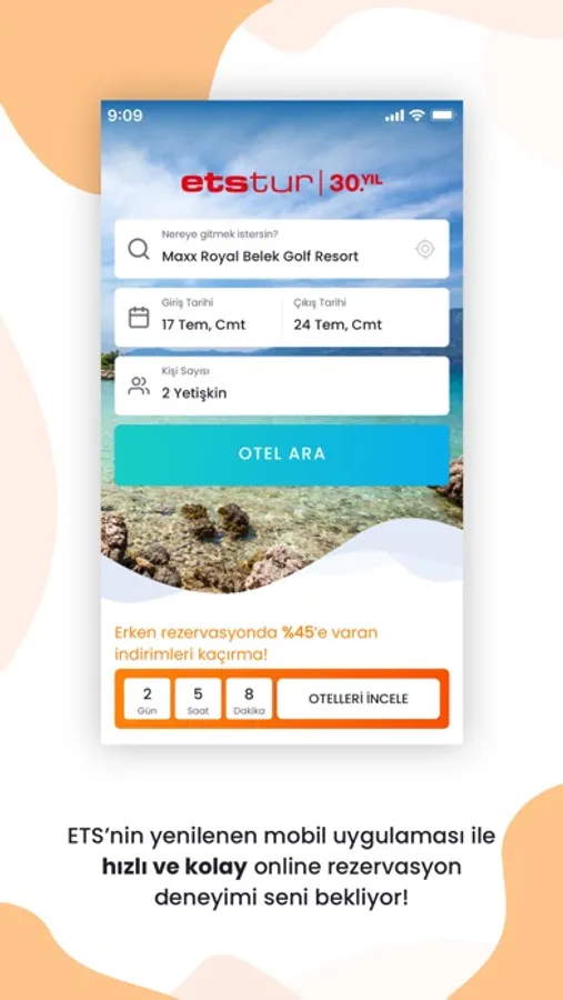 Otel araması yapın, fiyatları karşılaştırın ve bütçenize en uygun tesis için kolayca rezervasyon yapın. Seyahat planı mı yapıyorsunuz? ETS’nin mobil uygulamasını indirin, güncel promosyonları ve tatil fırsatlarını kolaylıkla takip edin. Yurt içinde ve yurt dışında binlerce otel seçeneğinin yanı sıra dünyanın dört bir yanında düzenlenen zengin içerikli turlar, son dakika fırsatları ve promosyonlu uçak bileti gibi seçenekler de kolay rezervasyon ayrıcalığı ile mobil uygulamada sizi bekliyor.