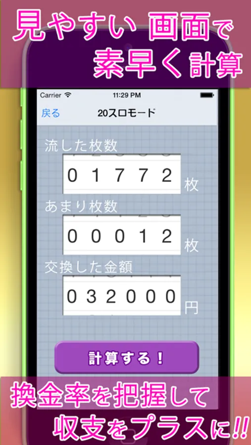 「流した枚数」「あまり枚数」「交換した金額」を入力するだけで換金率を算出します。