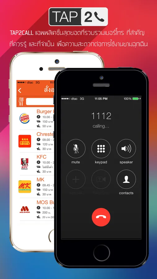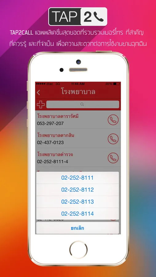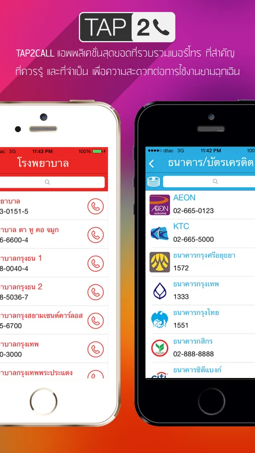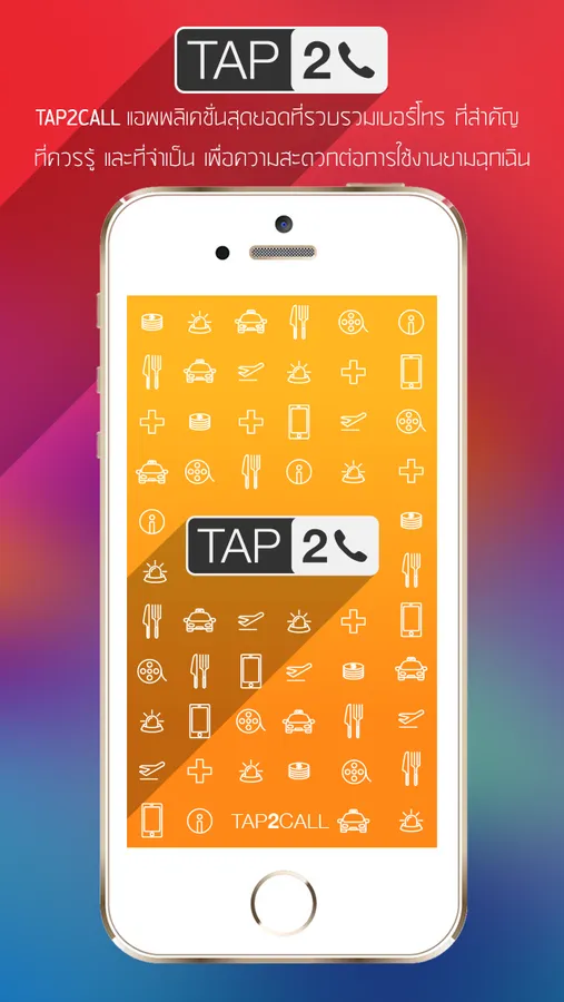 Tap2Call เป็นแอพพลิเคชั่นที่รวบรวมเบอร์โทรสำคัญ หมายเลขที่จำเป็น ที่สามารถตอบทุกความต้องการของคุณ เช่น เบอร์โทรสั่งอาหาร เบอร์โทรโรงภาพยนตร์ เบอร์โทรสายการบิน เบอร์โทรโรงพยาบาลหรือแจ้งเหตุฉุกเฉิน เป็นต้น ซึ่งคุณสามารถใช้งานได้อย่างง่ายดาย โดยโทรออกผ่านทางแอพพลิเคชั่นได้ทันที