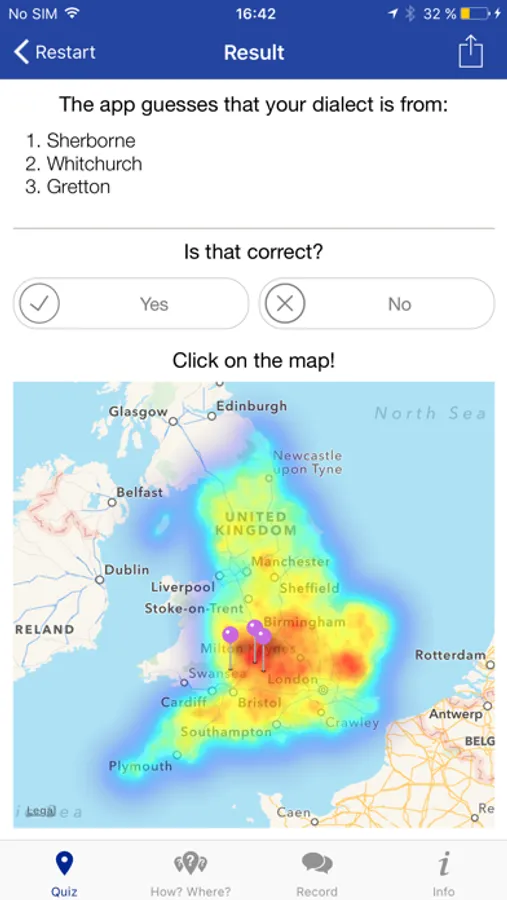 Did your home dialect change over time? Our algorithm is based on historical data from the Survey of English Dialects. If it guesses where you are from correctly, your home dialect has probably remained stable over the past decades. If the guess is far off, however, it is probably because of dialect change.
