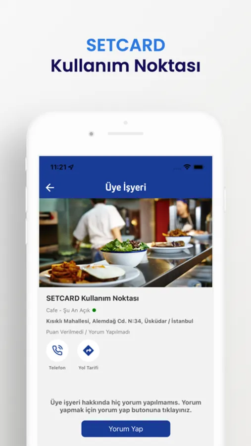 • Size en yakın Setcard anlaşmalı noktalarını listeleyebilir ve harita üzerinden detaylı yol tarifi alabilirsiniz. Ayrıca üye işletmeler için yorum yapabilir ve puan verebilirsiniz.