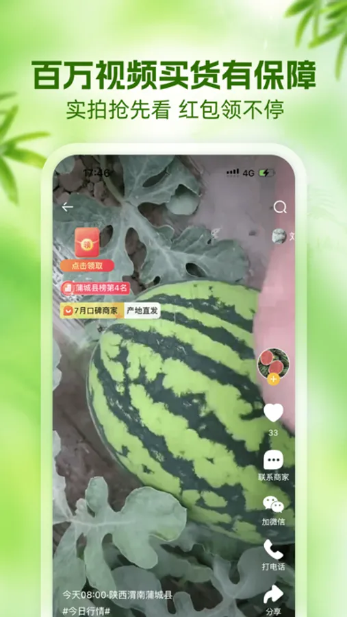 看视频领红包。视频现场带你轻松了解货源新动态,掌握新农技,还能围观田里人的日常娱乐。买货不乏味,福利领不停。