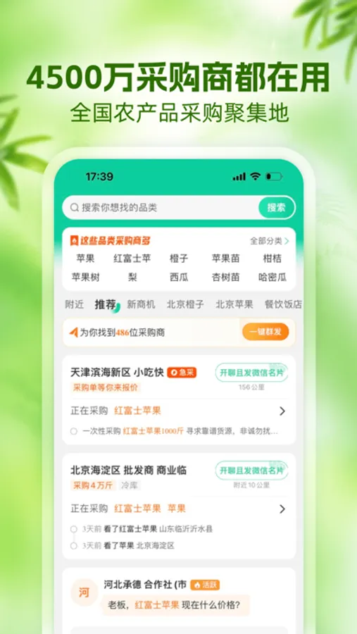 农产品批发商、超市采购、餐饮采购、合作社、食品加工厂等全国农产品采购商聚集地,为全国农产品供应商打造大型客户市场,快速匹配采购需求促进农产品交易。