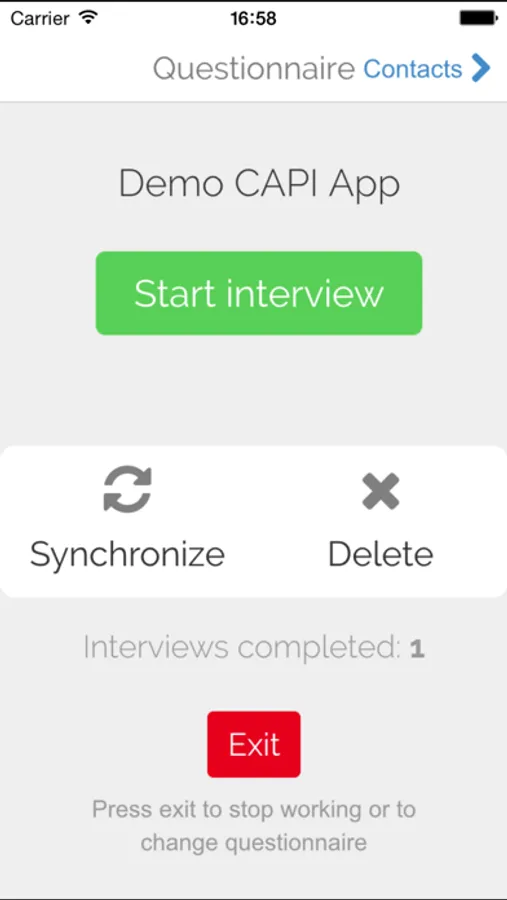 With IdSurvey CAPI you can collect data with quantitative and qualitative surveys. You just have to download the questionnaires using the link provided by your supervisor and you can immediately start working. If you don’t have an assigned survey to work with, try the demo included in the app.