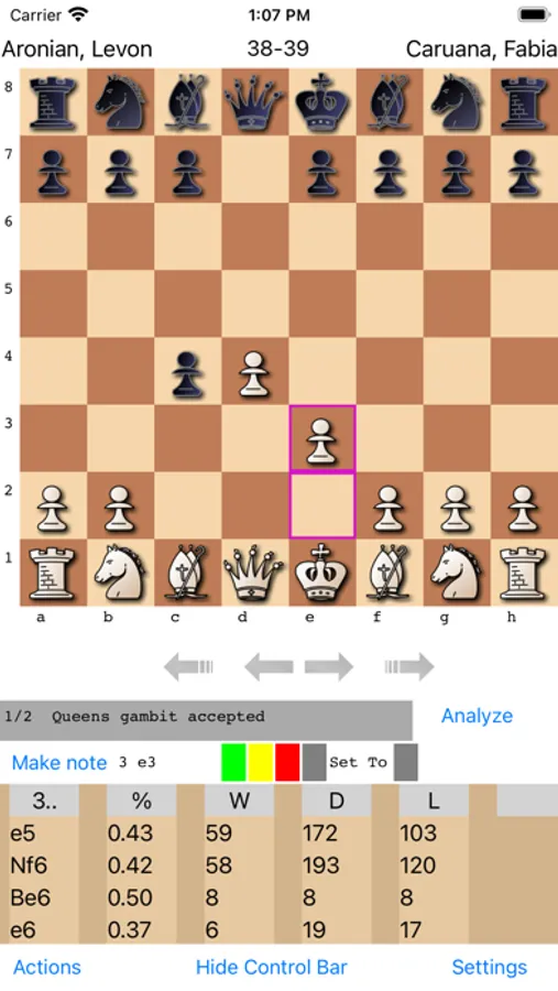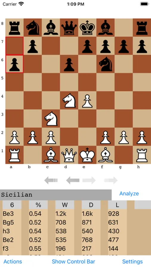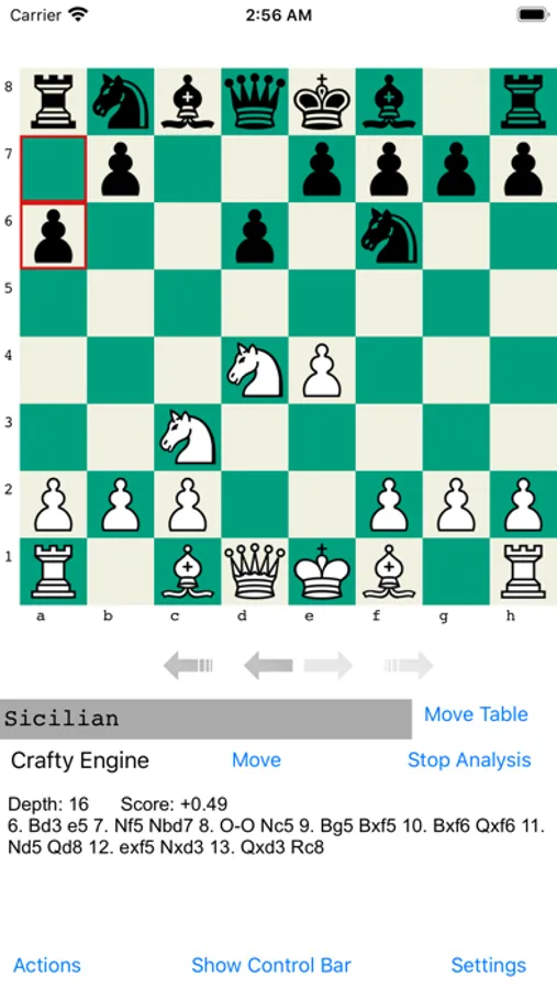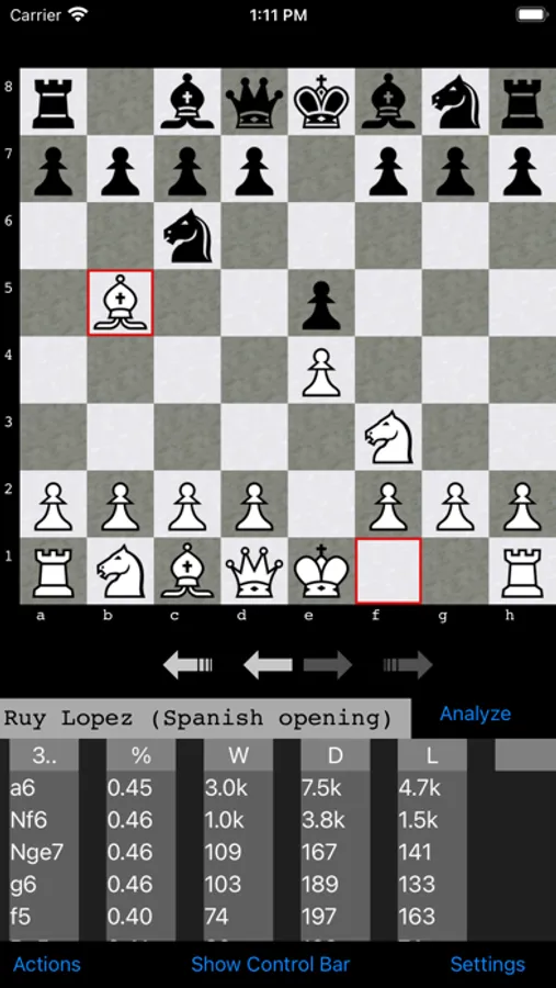 In the Actions menu if the user has imported a PGN file to the App, for example by opening a PGN file with OpeningTree from a mail attachment or download(long touch on the attachment/download for this option), a game from a PGN file can be loaded and checked against the book. If a user makes a new move, back up to the main line to return to the game. To ensure speed, it will only read/load a max of 5000 games. With bigger files users will only see first 5000 games.