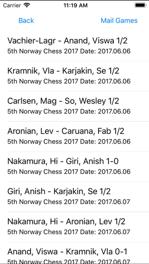 The App comes with six PGN game files that can be optionally installed when no PGN files have yet been opened by the App or the user has deleted their PGN files previously opened and likewise has none to access. If this is the case, this option shows when going to Actions → load PGN. The files contain a mix of famous classical games, a collection of former world champion Gary Kasparov's games and more recent games from two top ranked international tournaments.