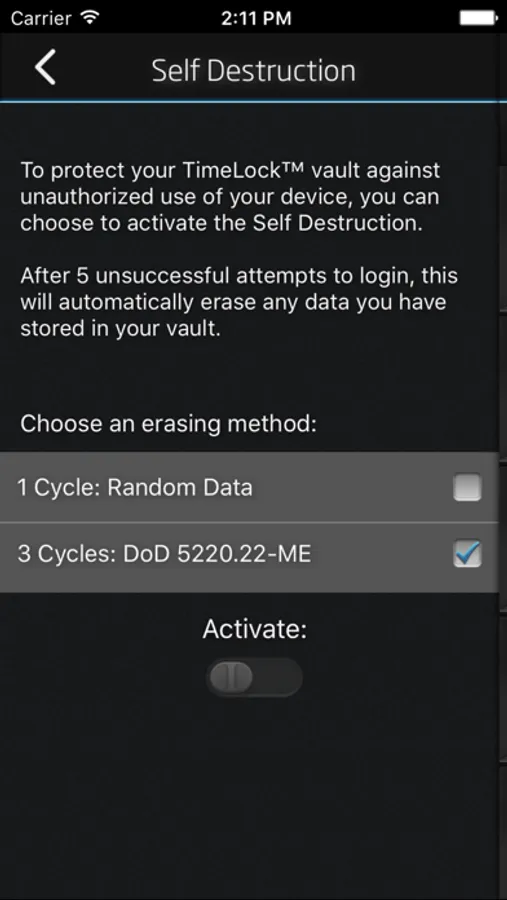 Should you lose or have your Apple™ device stolen, do not worry about the protection of your photos and videos stored in TimeLock™: Self-destruction of TimeLock™ PRO can be activated, to automatically delete all saved data in it after 5 incorrect passcode entries. It is not just simply deleted, instead the entire contents of the safe is securely overwritten.