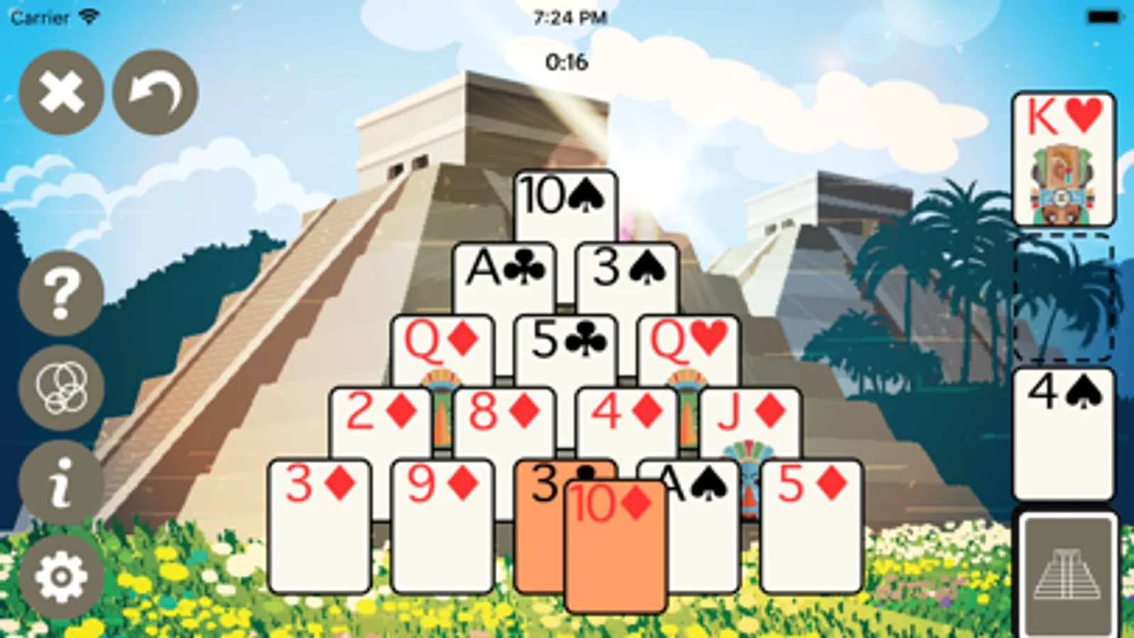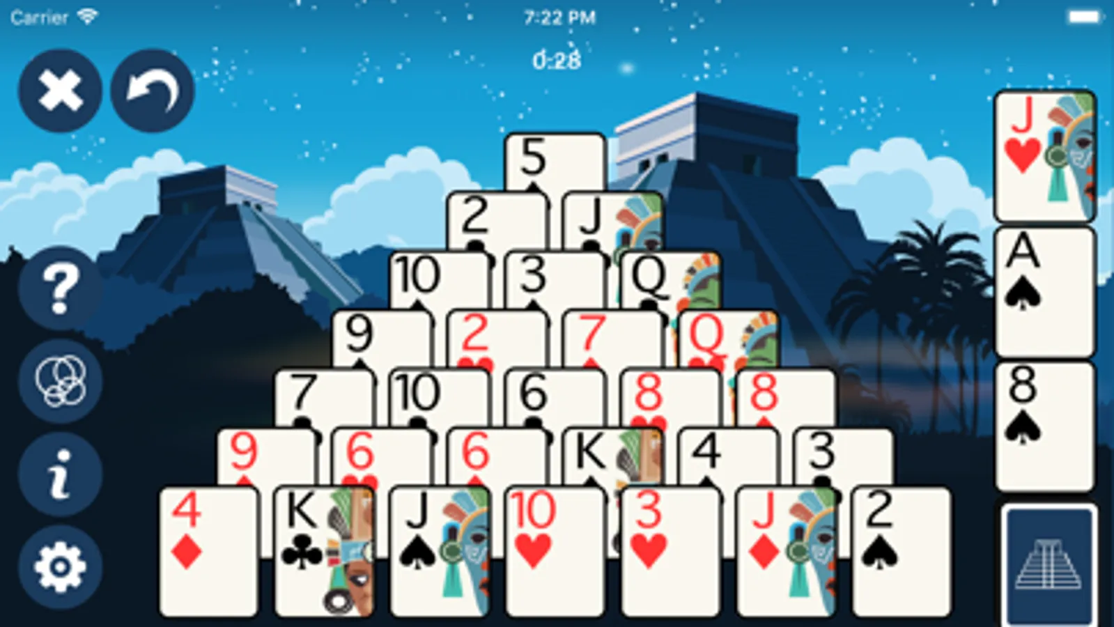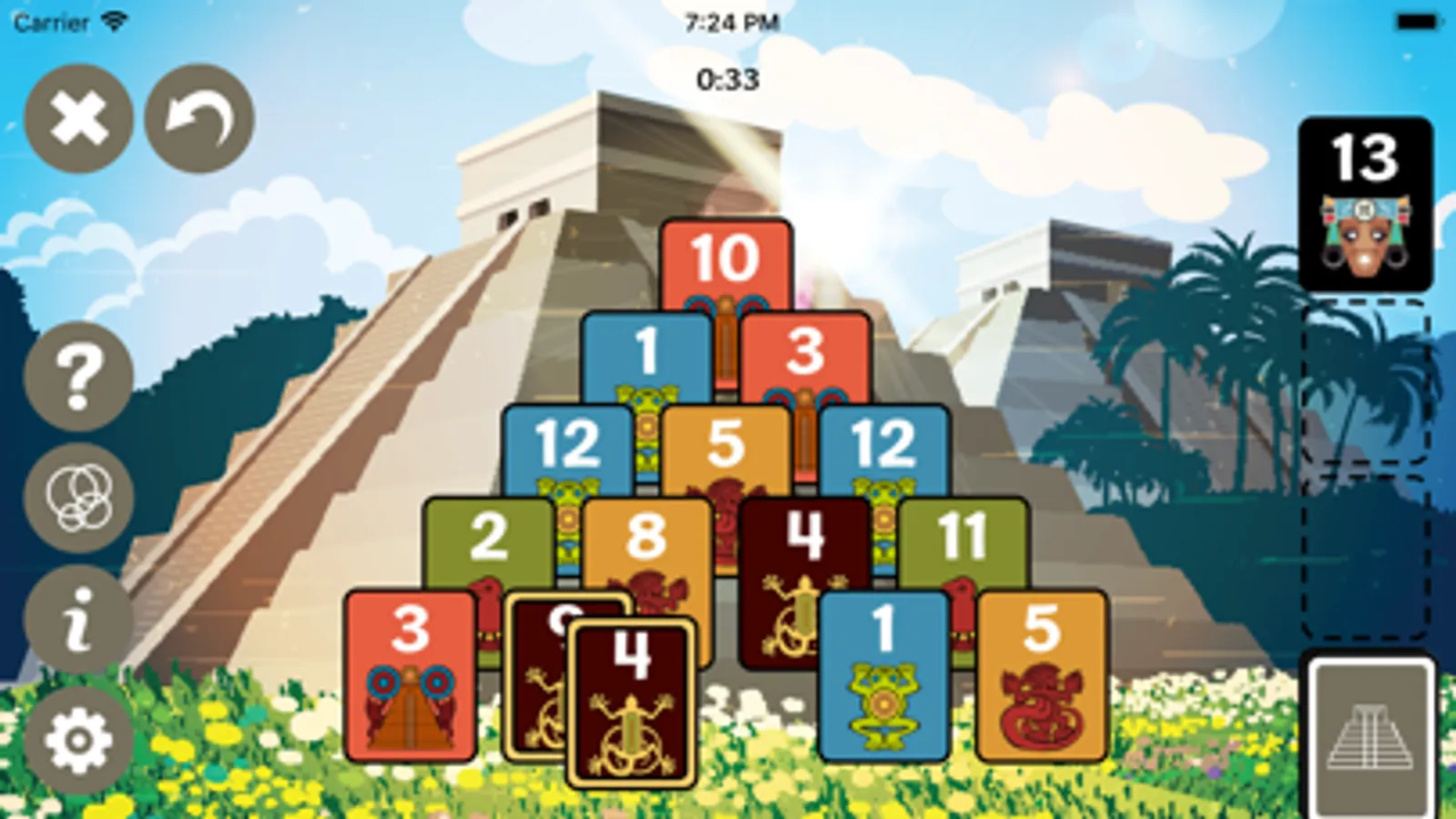 Pyramid is a solitaire card game favorite -- and this version is even more fun with an optional Aztec pyramid motif. Tap 2 cards that add up to 13; or drag one card onto another to make 13. Choose number of rows, background, card face, and submit your best scores to Game Center.