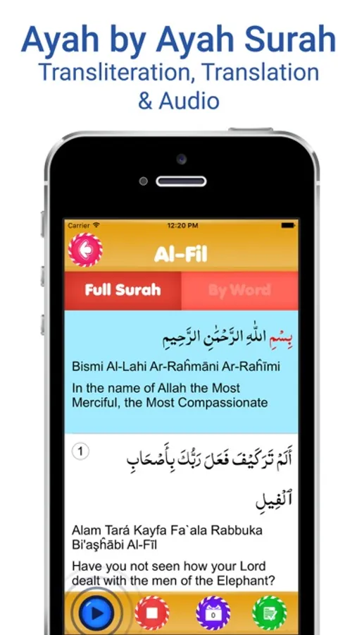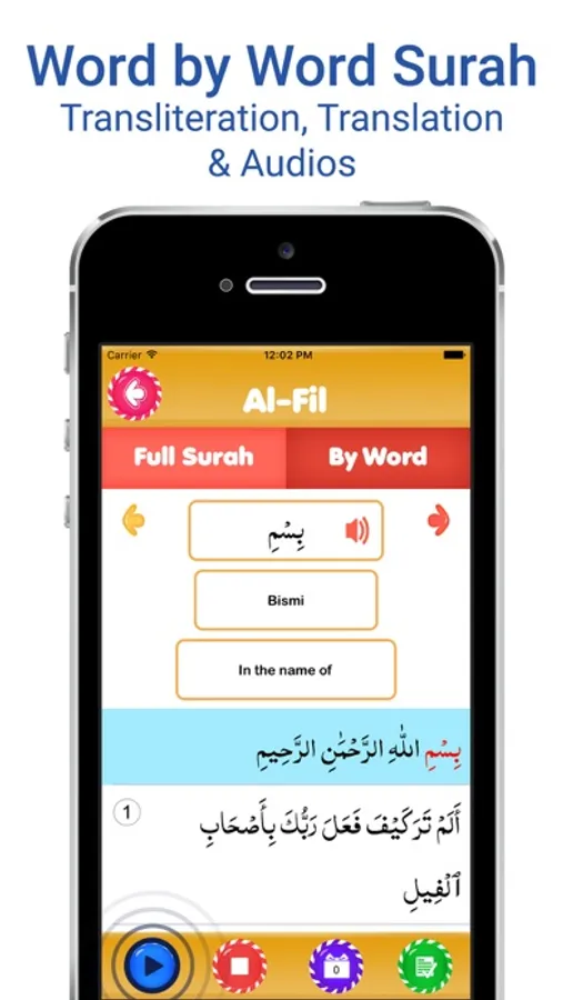 This App offers audio recitation with beautiful and attractive interface for kids. Word by word translation, transliteration and audios are provided to help kids in easy learning and pronunciation of short Surahs of Al-Quran.