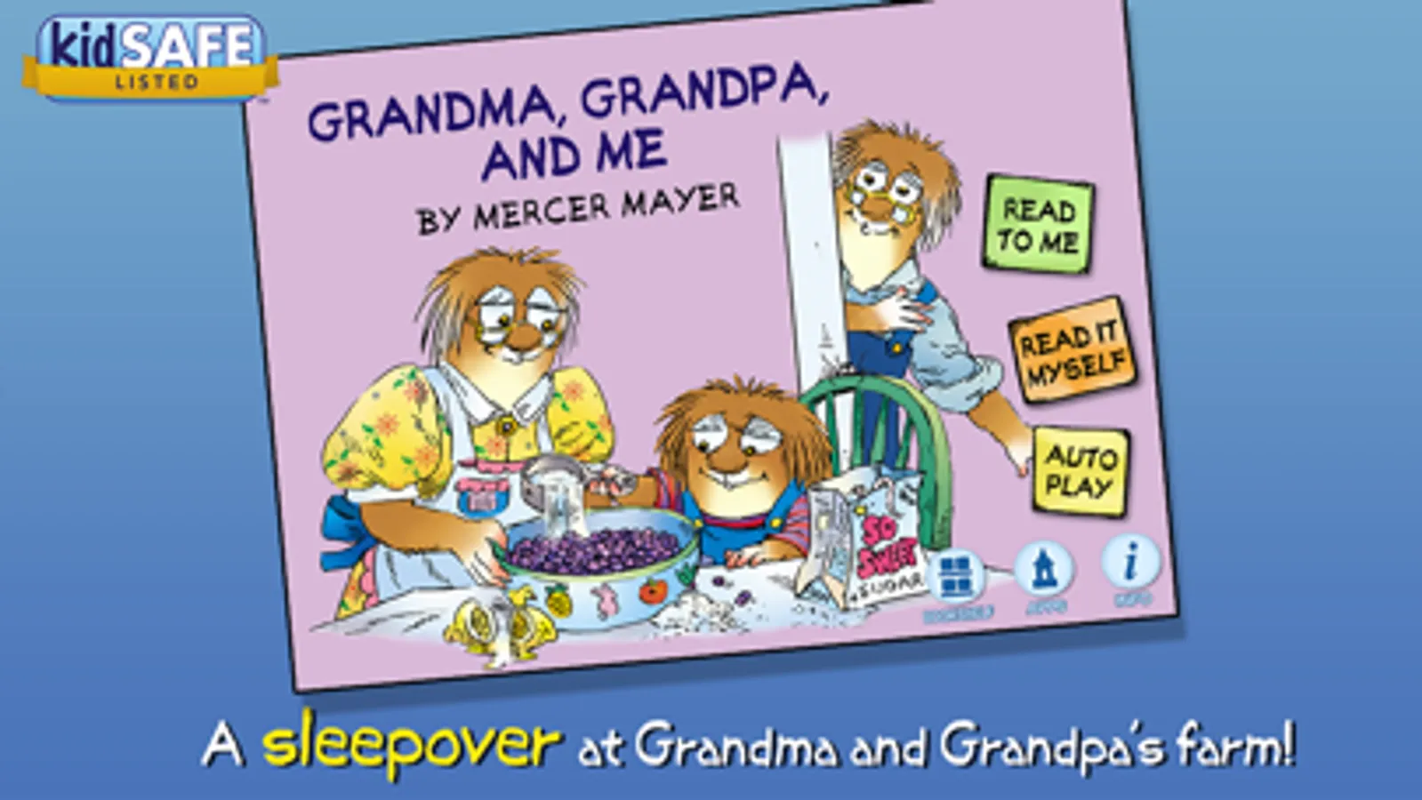 Join Little Critter in this interactive book app as he has a sleepover at Grandma and Grandpa’s farm! Explore pictures, learn new vocabulary, and personalize the story with your own narration. Come along as Little Critter helps his grandparents milk the cows, pick blueberries, and bake a pie- with a secret ingredient- for the contest at the Country Fair!