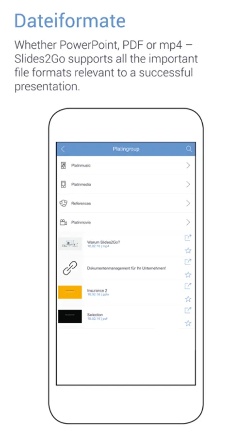 Whether the file takes the PowerPoint, PDF, Office files or mp4 format– Slides2Go supports all important file formats relevant for a successful presentation. Multimedia content embedded in PowerPoint is played back and displayed perfectly.