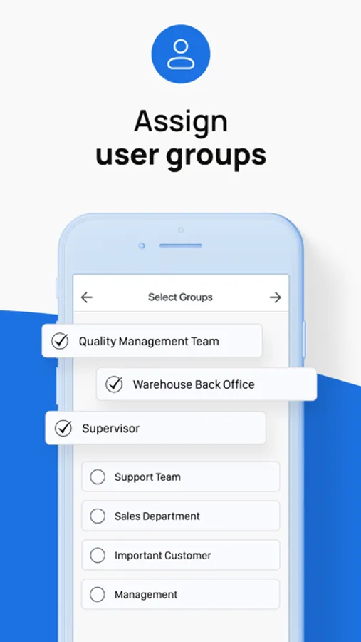 - Group feature incl. regulation of access rights (for customers, departments, suppliers..)