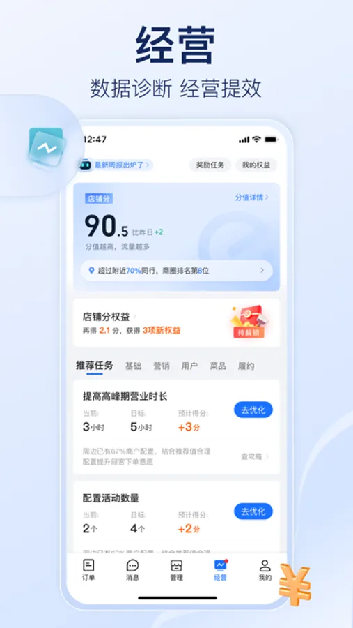 面向饿了么餐饮商户提供线上开店、接单、配送、营销、数据等多样服务。让您用手机轻松管理外卖餐厅,随时调整营业、活动、商品库存等,快把您的餐厅搬到饿了么平台,接收海量外卖订单吧!