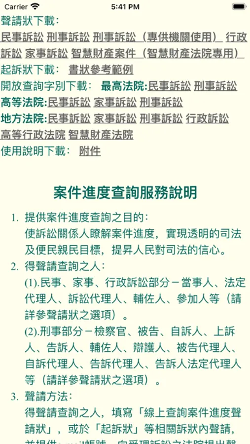 1. 得聲請查詢之人,填寫「線上查詢案件進度聲請狀」,或於「起訴狀」等相關訴狀內聲請,並提供e-mail帳號,向受理訴訟之法院提出聲請核可後,即可透過本程式查詢事實審刑事、民事(含家事)及行政訴訟之案件進度