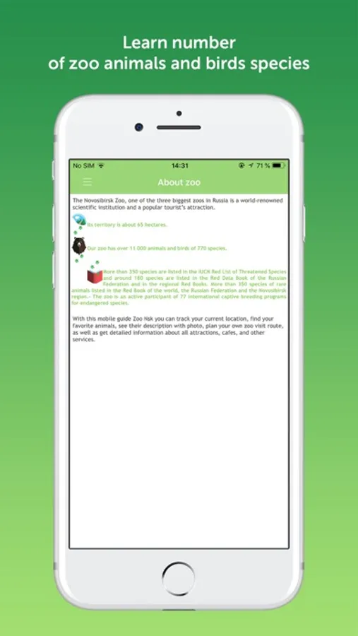 Zoo Nsk is a free mobile application for Rostislav Shilo Novosibirsk zoo, one of the three biggest zoos in Russia. Zoo Nsk is provided to navigate on the zoo territory and to inform visitors about the zoo animals, attractions, working hours, and services. The Zoo Nsk app is a great chance to make your visit to Rostislav Shilo Novosibirsk zoo more interactive and usable. The zoo has over eleven thousand animals from all over the world and is an active participant of different captive breeding programs for endangered species.