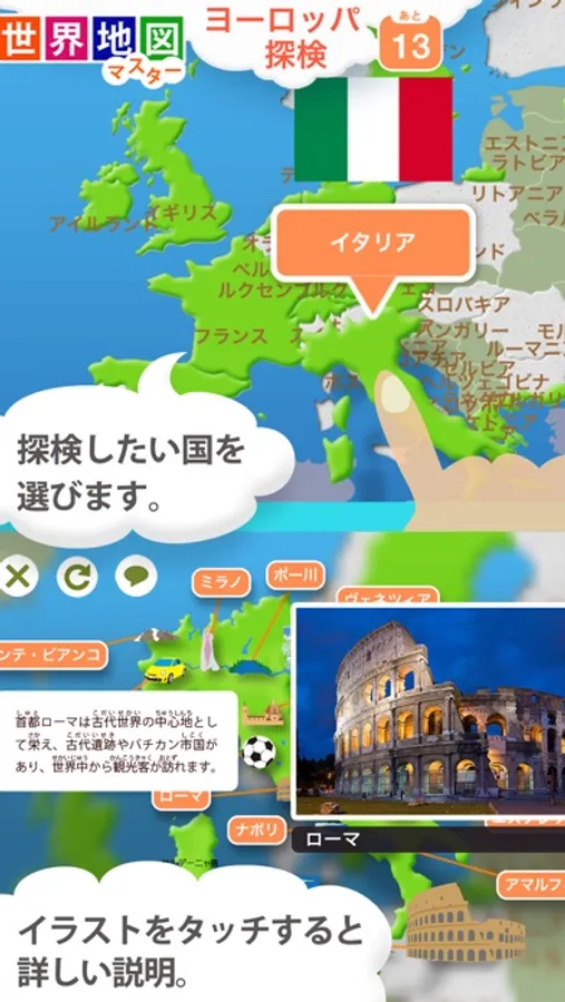 ・子供から大人まで地理が苦手な方でも、アプリを指でタッチすることにより、国の場所や位置関係、特色などを覚えることができます。