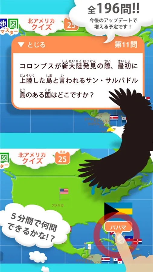 「クイズ」は「探検」で覚えた内容から問題がランダムに出されます。5分間で何問答えられるか、「探検」で得た知識を試す場です。