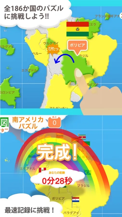 「パズル」は地図上に散らばった国をそれぞれの場所にはめ込むことで位置を覚えます。