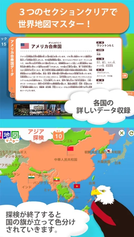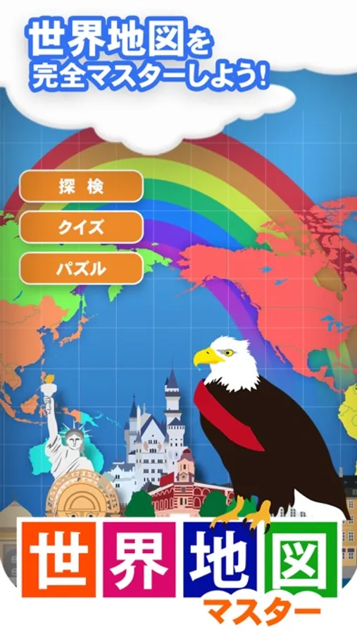 「世界地図マスター」は、世界の国々の特色をビジュアルで覚えることができる社会科アプリです。