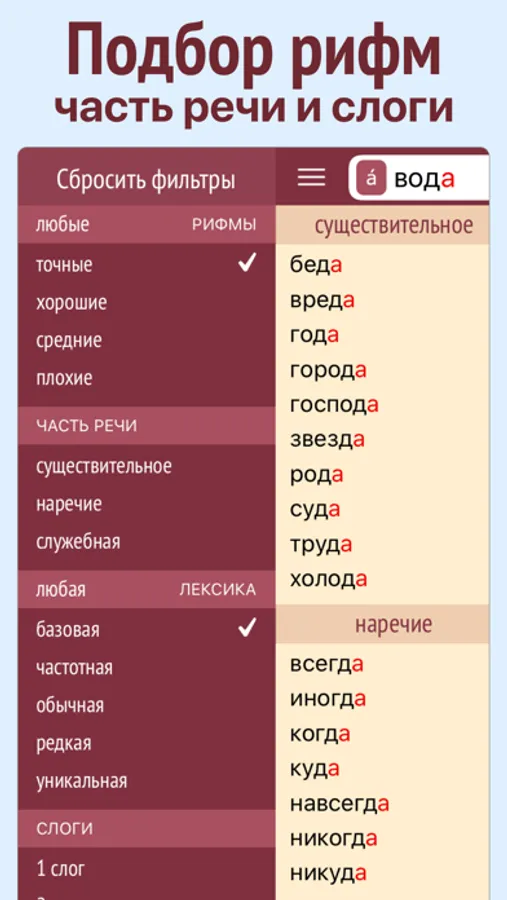 • The filter of results by quality rhyme, part of speech, lexical frequency, a number of syllables.