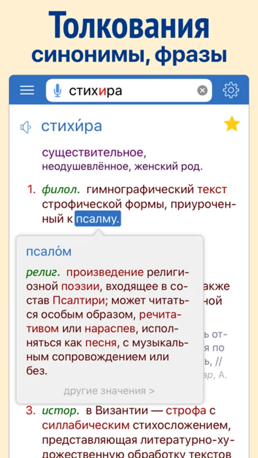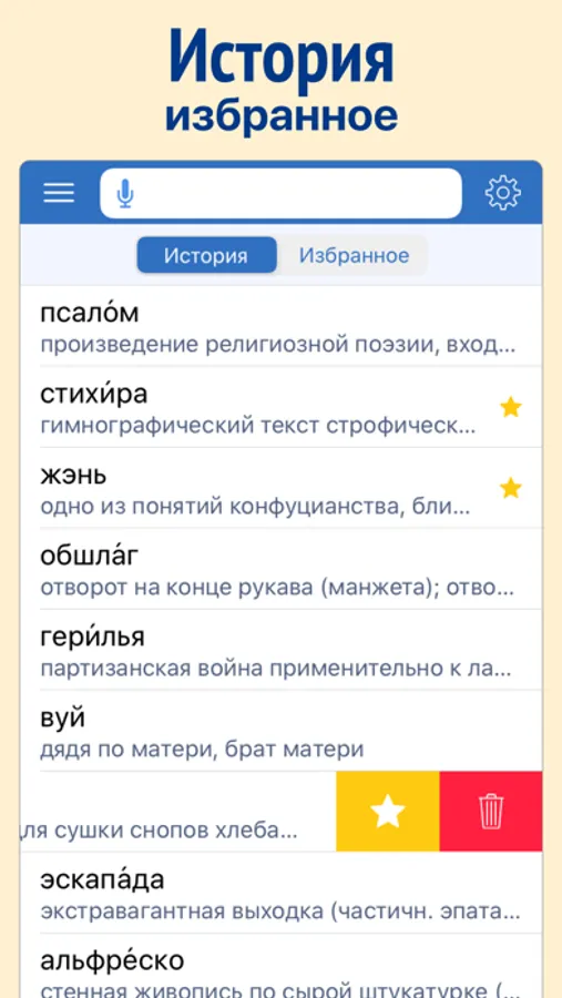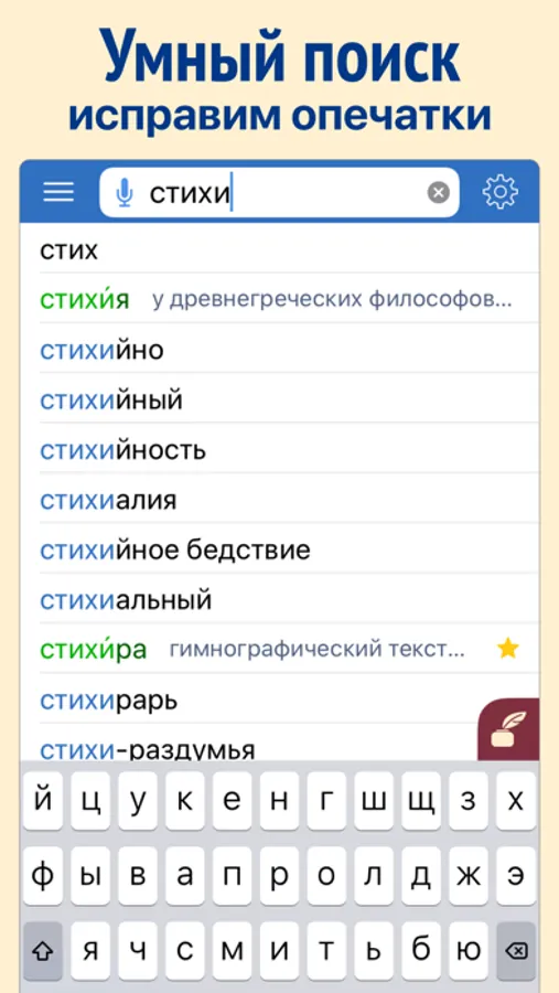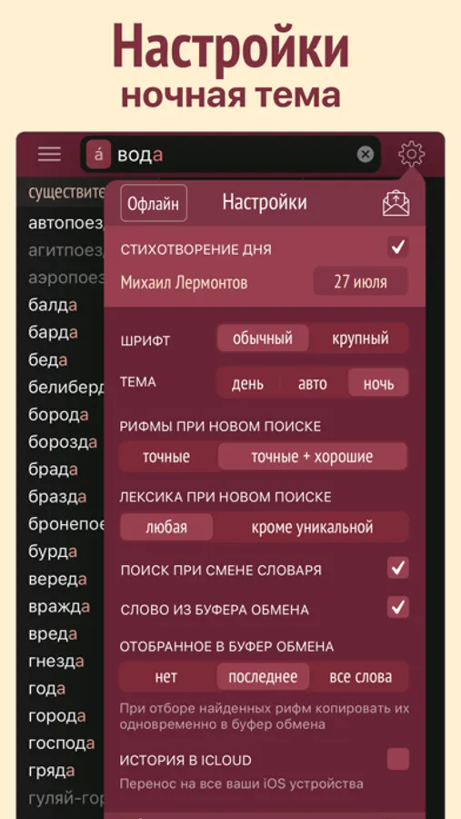 • Search history and Favorites: you can mark your favorite rhymes. Also you can sync History between all your iOS devices via iCloud (when subscribing to Offline mode).