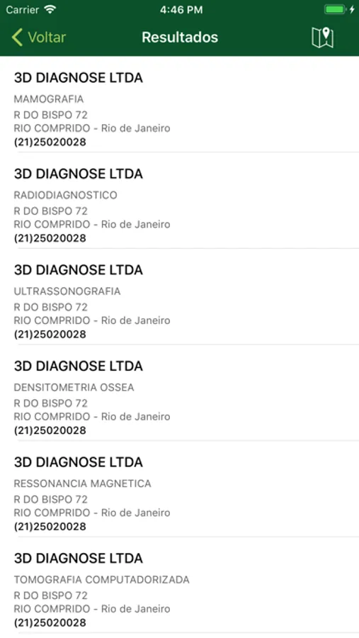 Guia de bolso FioSaúde. Com uma interface simples e intuitiva, identifica médicos, clínicas, laboratórios, hospitais e demais estabelecimentos de saúde mais próximos do usuário, de acordo com o plano contratado.