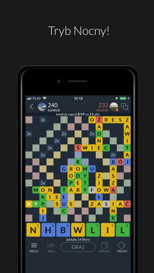 • układaj słowa na planszy z dostępnych na stojaku płytkach