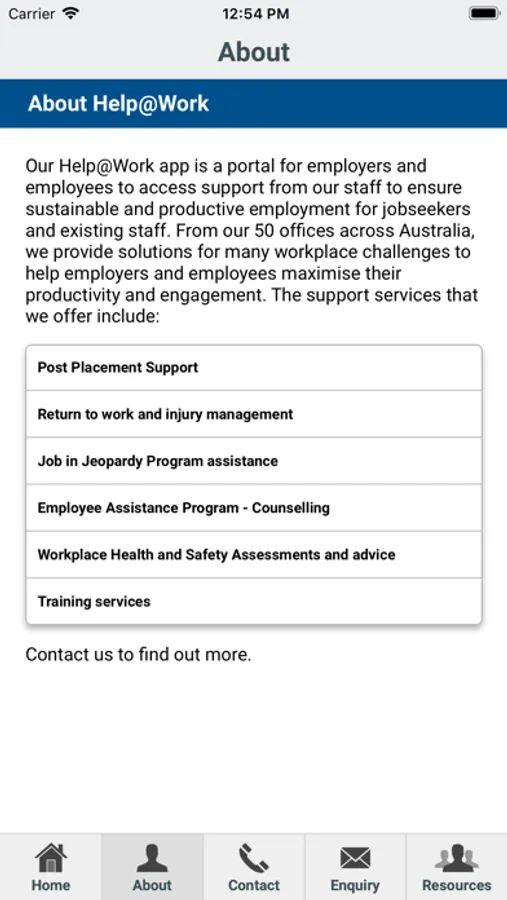 The Help@Work app is a portal for Australian employers and employees to access support from our staff to ensure sustainable and productive employment. We have many offices around Australia providing solutions for various workplace challenges to help employers and employees maximise their productivity and engagement.