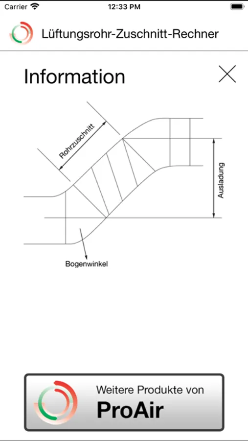 Pro Air ist ein nützlicher Lüftungsrohr-Zuschnitt-Rechner. Mit Hilfe des Versatz-Rechners kann in Sekundenschnelle der Rohrzuschnitt errechnet werden. Für Winkelbögen von 15°, 30°, 45°, 60° und 90° können somit Rohrzwischenlängen exakt auf der Baustelle vorgefertigt werden.