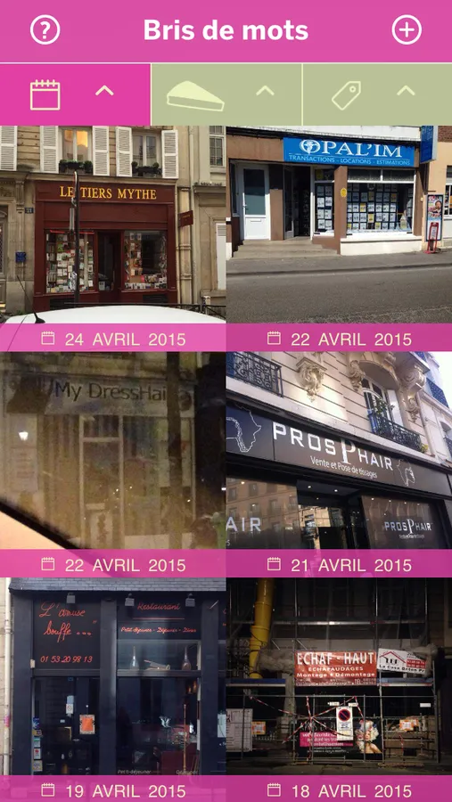 Véritable Appellation d'Origine (non) Contrôlée, l'application "Bris de mots" permet de naviguer au travers d'une collection de photographies qui représentent les devantures de magasins les plus créatives de France, voire du Monde si affinités linguistiques. Salons de coiffure, bars, opticiens, toiletteurs canins, tous apportent leur pierre à l'édifice, participent à parfaire la devanture.