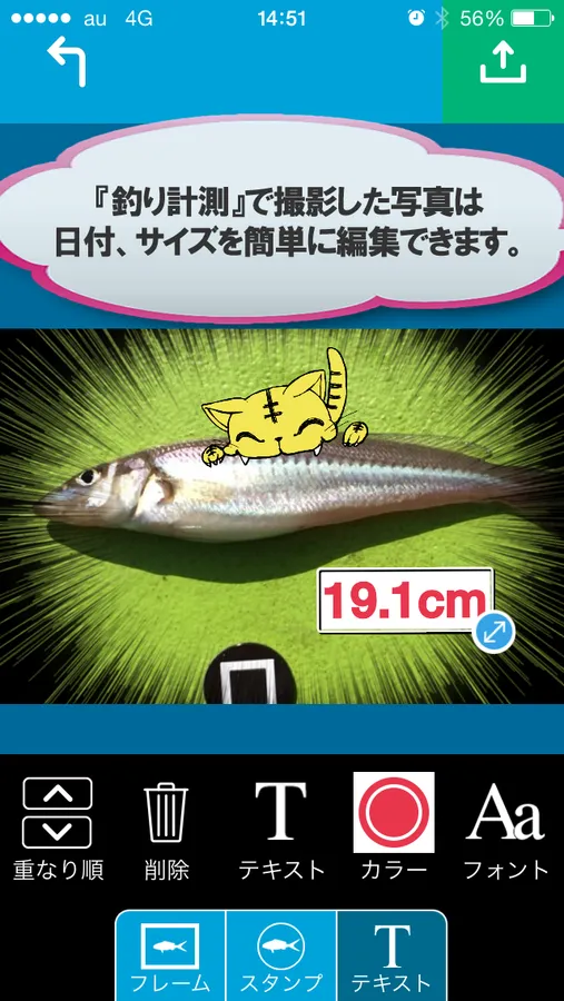 また、Hapyson『釣り計測アプリ』で撮影した写真は、釣った日付やサイズも目立つように編集できます。