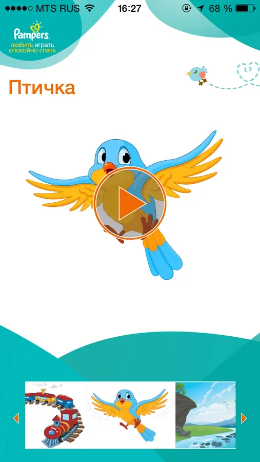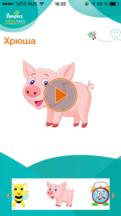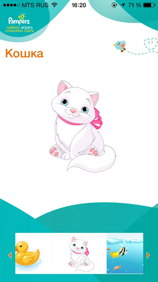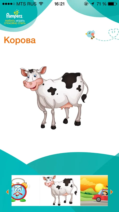 Приложение научит вашего малыша различать звуки! Выберите любой рисунок – например, изображение коровы – и нажмите на кнопку «звук». Корова замычит! А малыш запомнит, что это животное издает именно этот звук.