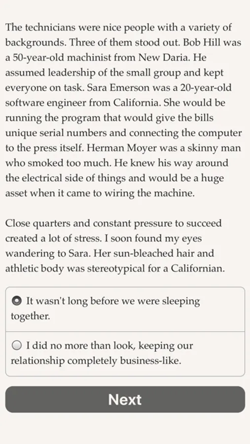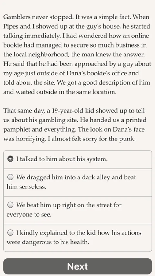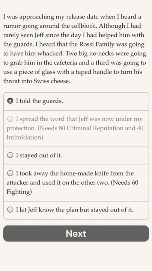 "Life of a Mobster" is a thrilling interactive novel where your choices control the story. The game is entirely text-based—without graphics or sound effects—and fueled by the vast, unstoppable power of your imagination.