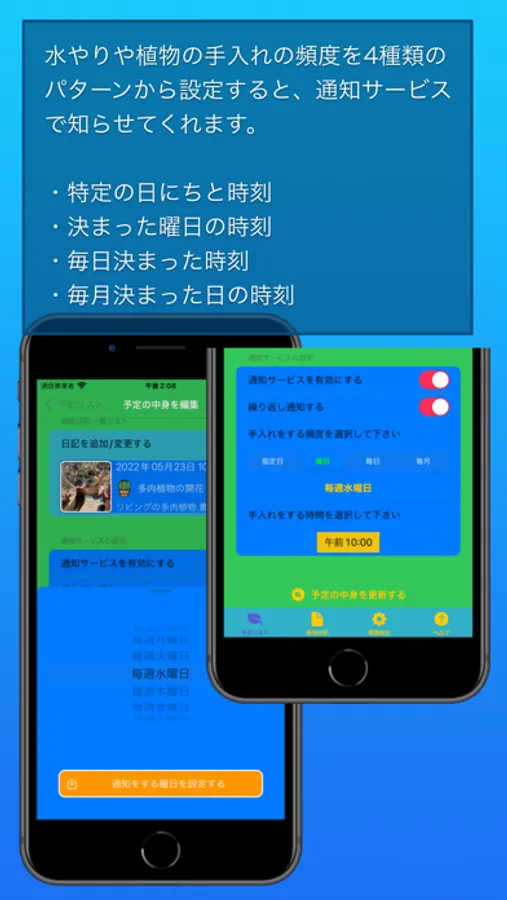 ・植物の水やりや手入れのタイミングを、4種類の頻度のパターンから設定し、通知サービスで知らせることができます。