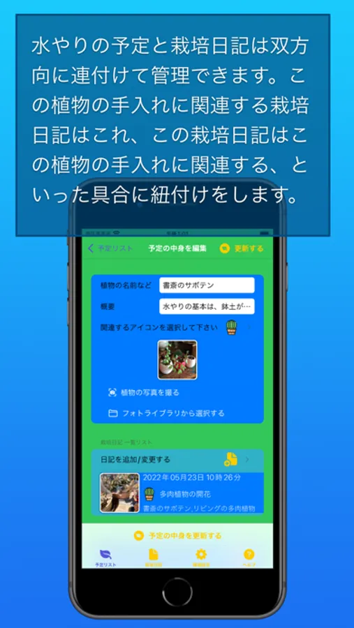 ・水やりの予定と栽培日記は双方向に連付けて管理できます。この植物の手入れに関連する栽培日記はこれ、この栽培日記はこの植物の手入れに関連する、といった具合に紐付けをします