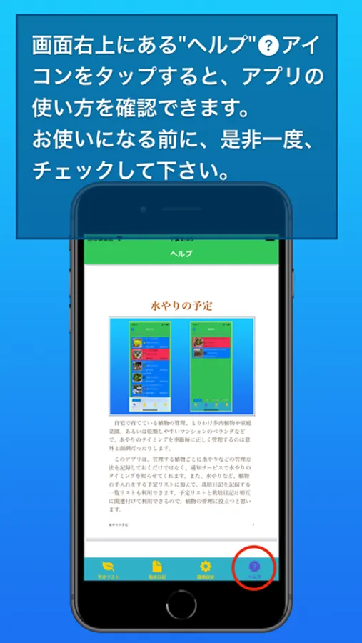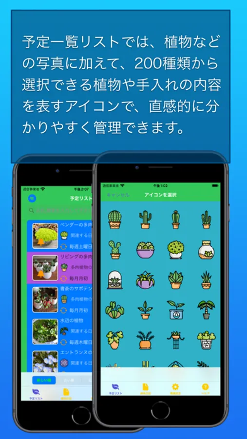 ・写真や200種類のアイコンで植物のお手入れの予定を一覧リストで分かりやすく管理できます。