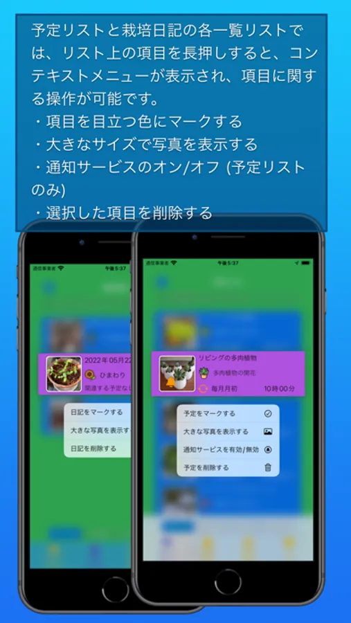 ・植物の水やりや手入れの予定データと関連付けた栽培日記を記録できます。
