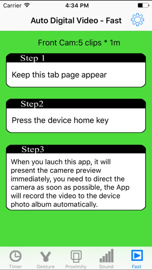 2 Fast: Just tap this App icon , so this App will be launched, after that, this App will record the video clips automatically.