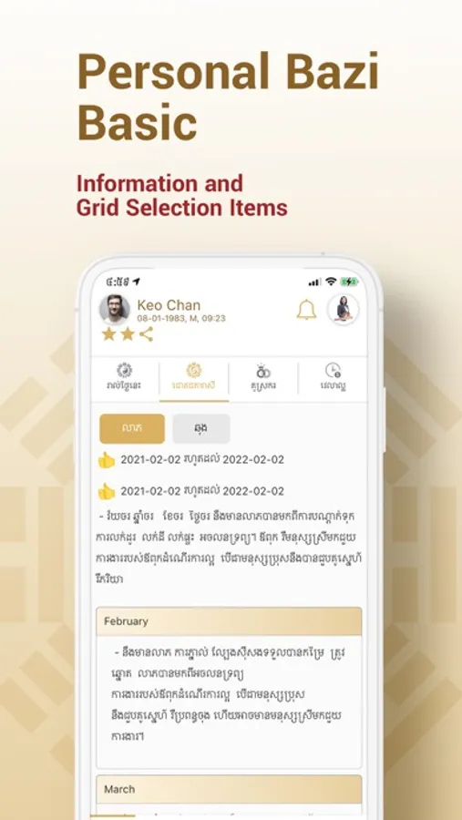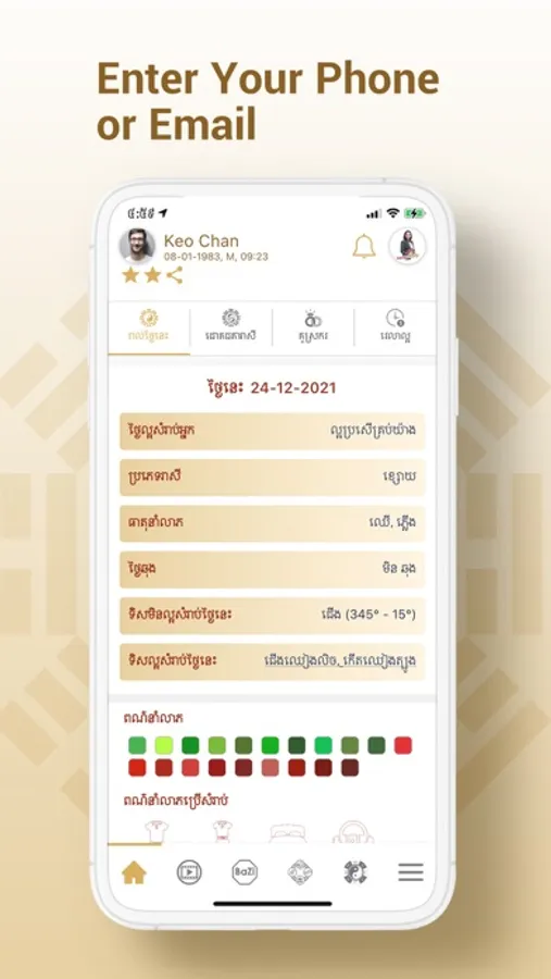 The app is not just a science-based astrology, but there are other techniques that allow us to prevent the clashes direction, well known favorable direction, steer clear of the day-to-day direction of the individual, and integrate them. More in the future for the convenience of our Cambodian and people in the world. It can confirm the life-story and the life-story of others by each individual. Just enter our birth date and birth time into the app, the app will show you our life-story and clearly as a rule.